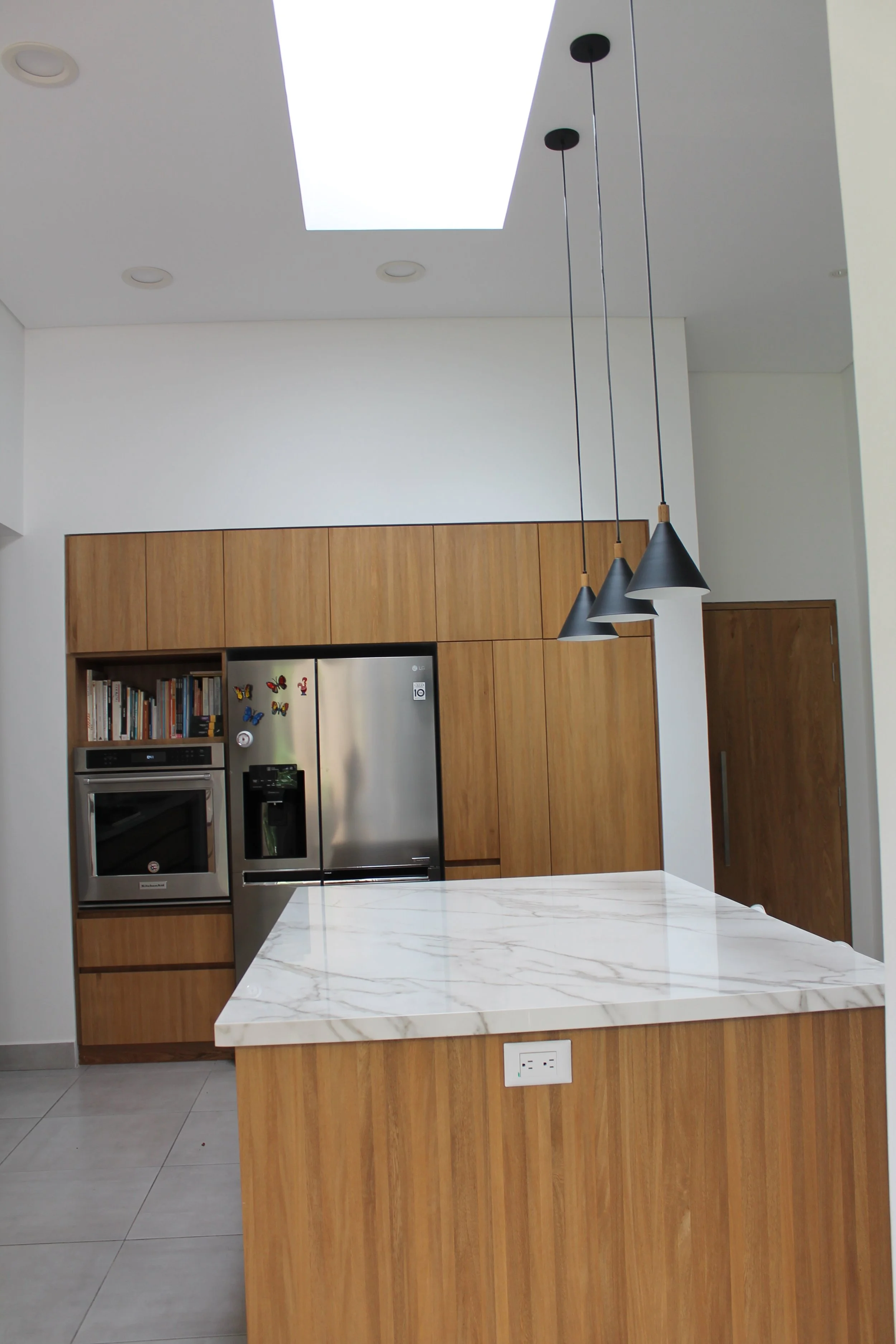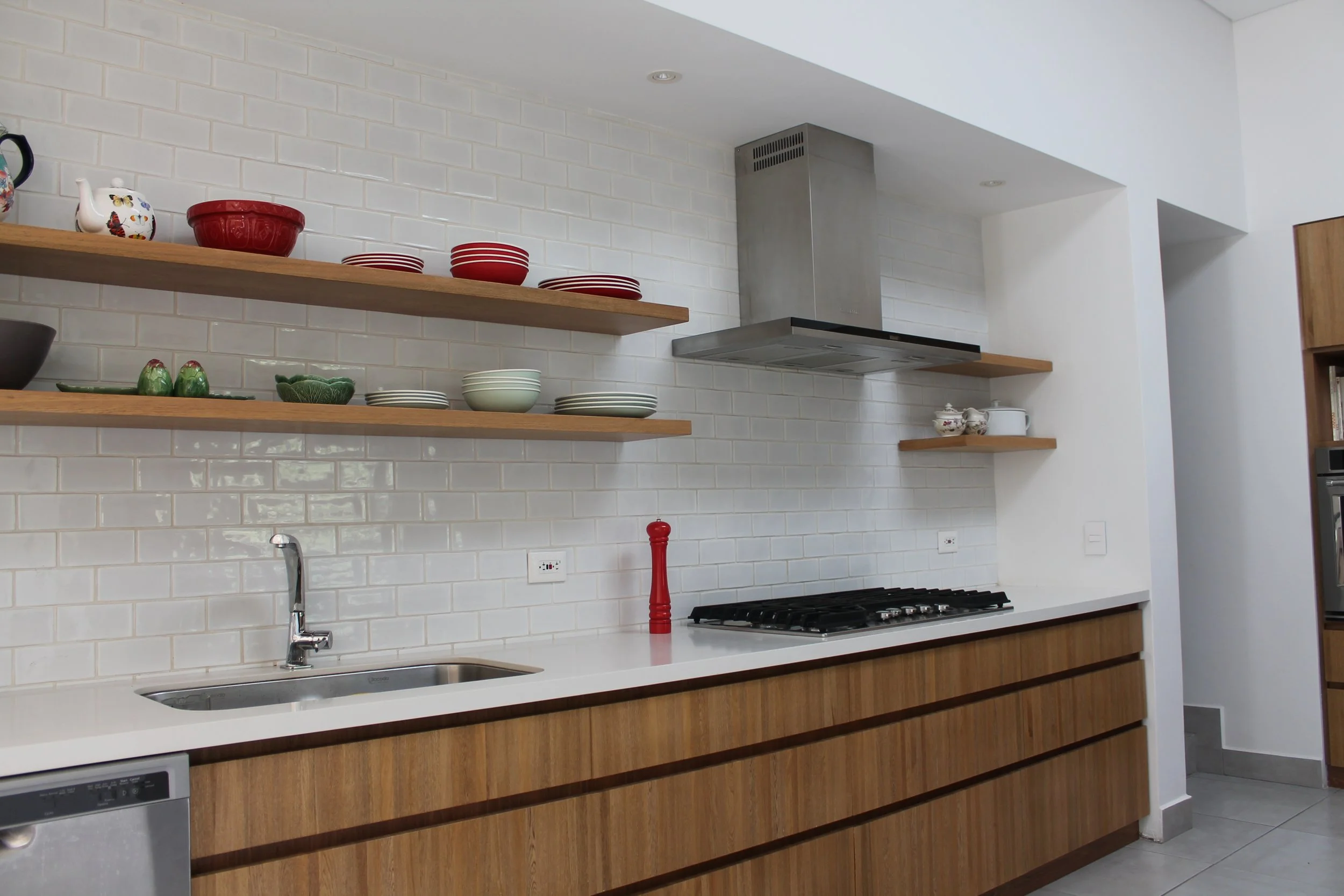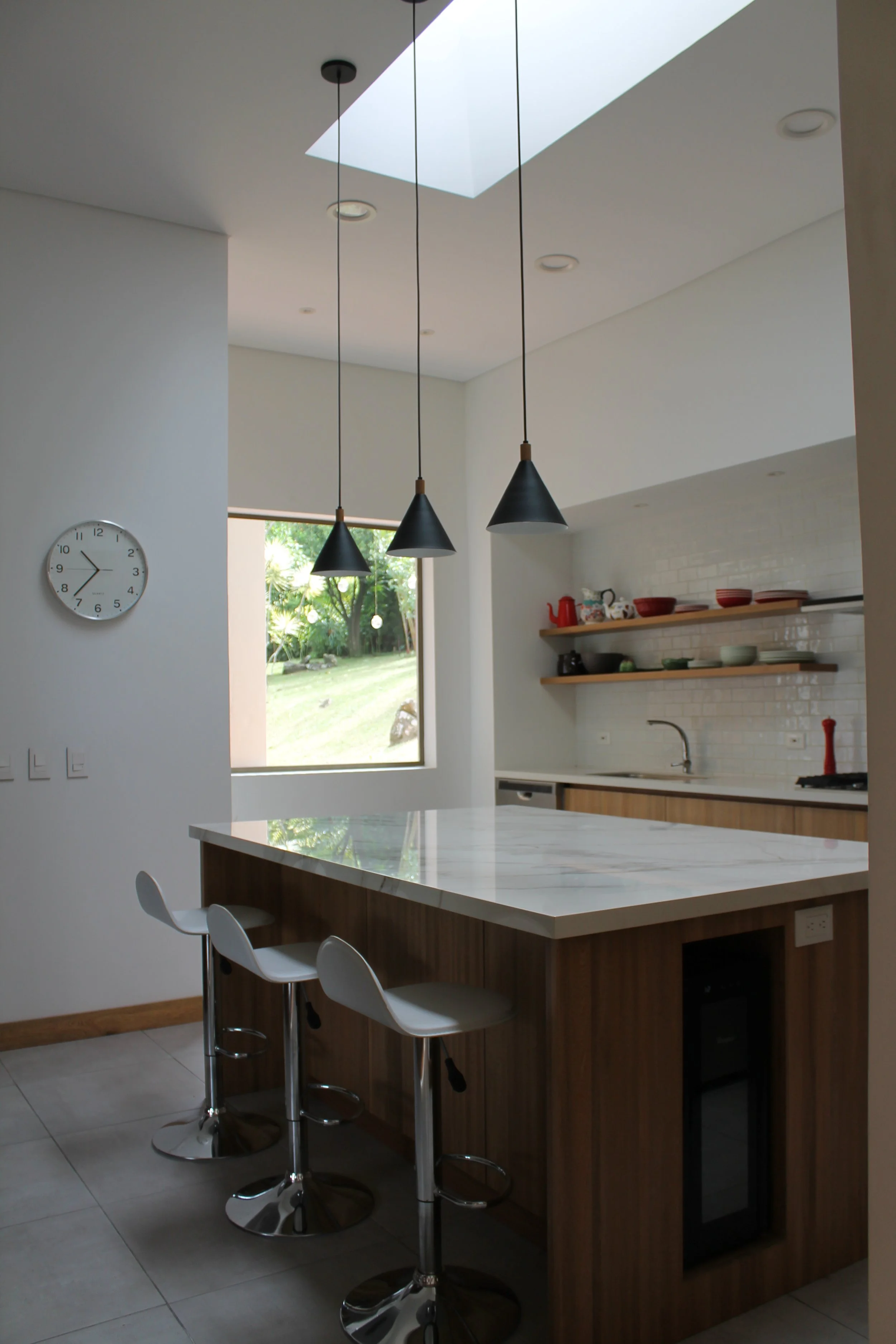 The original kitchen was small and enclosed, with no windows facing the expansive garden. Instead, it looked into a narrow interior patio once used for drying clothes—an area that, along with a large adjacent laundry space and a long internal hallway, occupied more than half of the kitchen’s footprint. This hallway connected the garage to the main entry hall and led to the dining room, separating it entirely from the kitchen. As a result, the kitchen lacked natural light, felt disconnected from the home’s social spaces, and had an inefficient layout: the refrigerator and pantry were located in the hallway, outside the cooking zone and difficult to access.