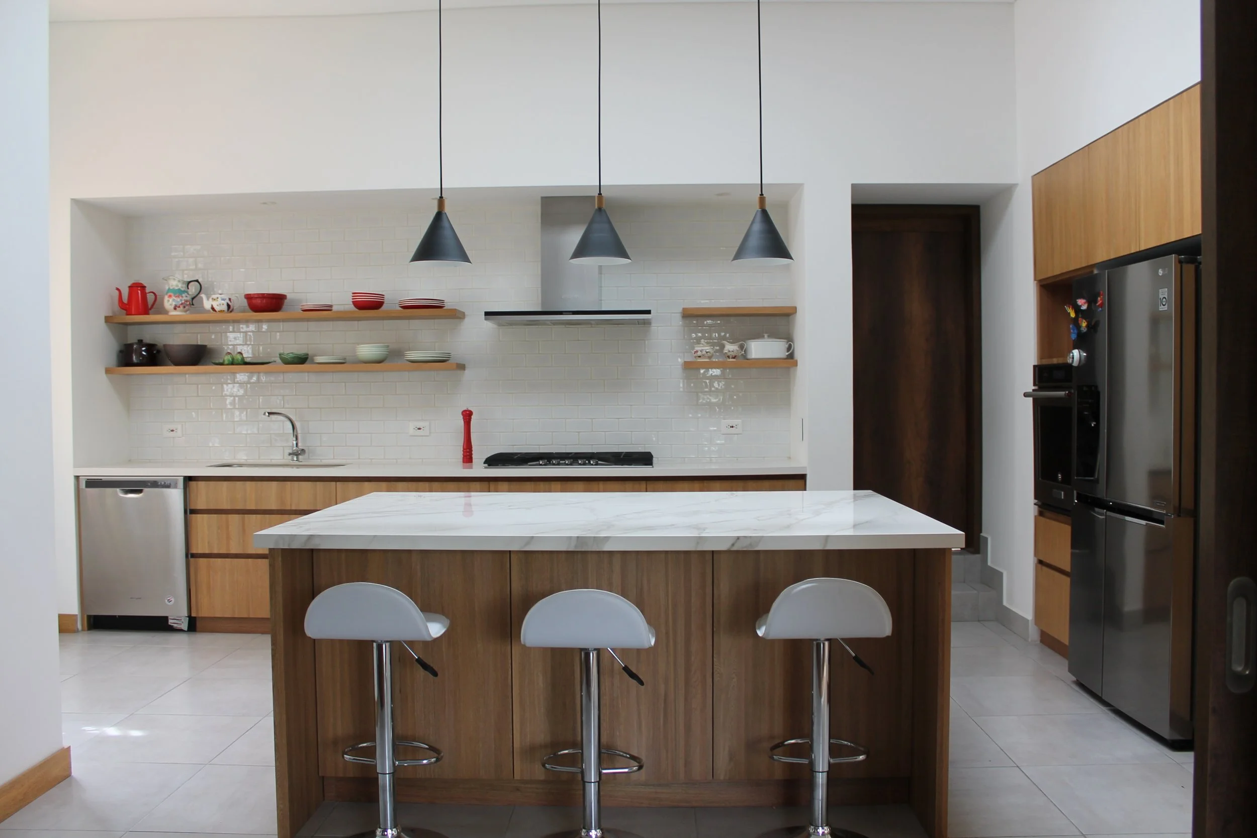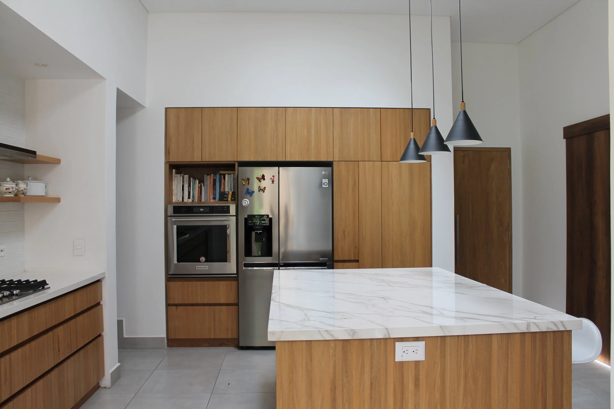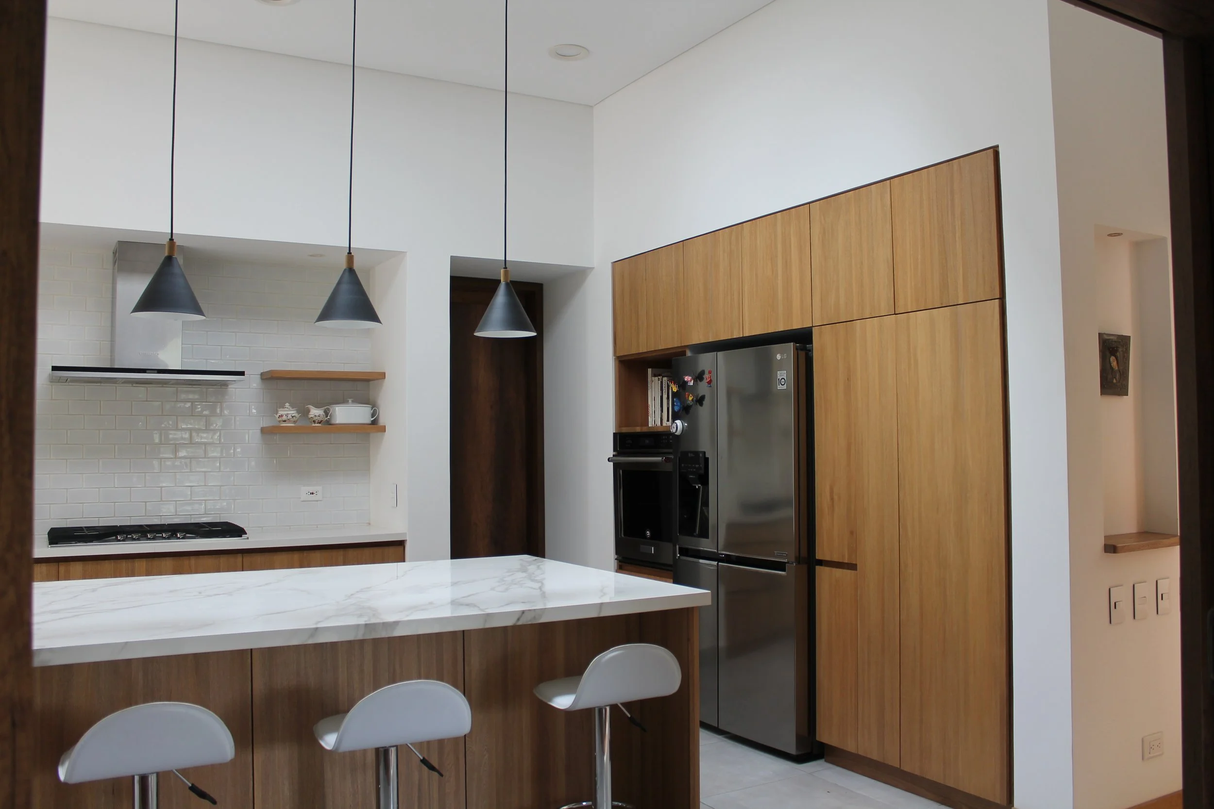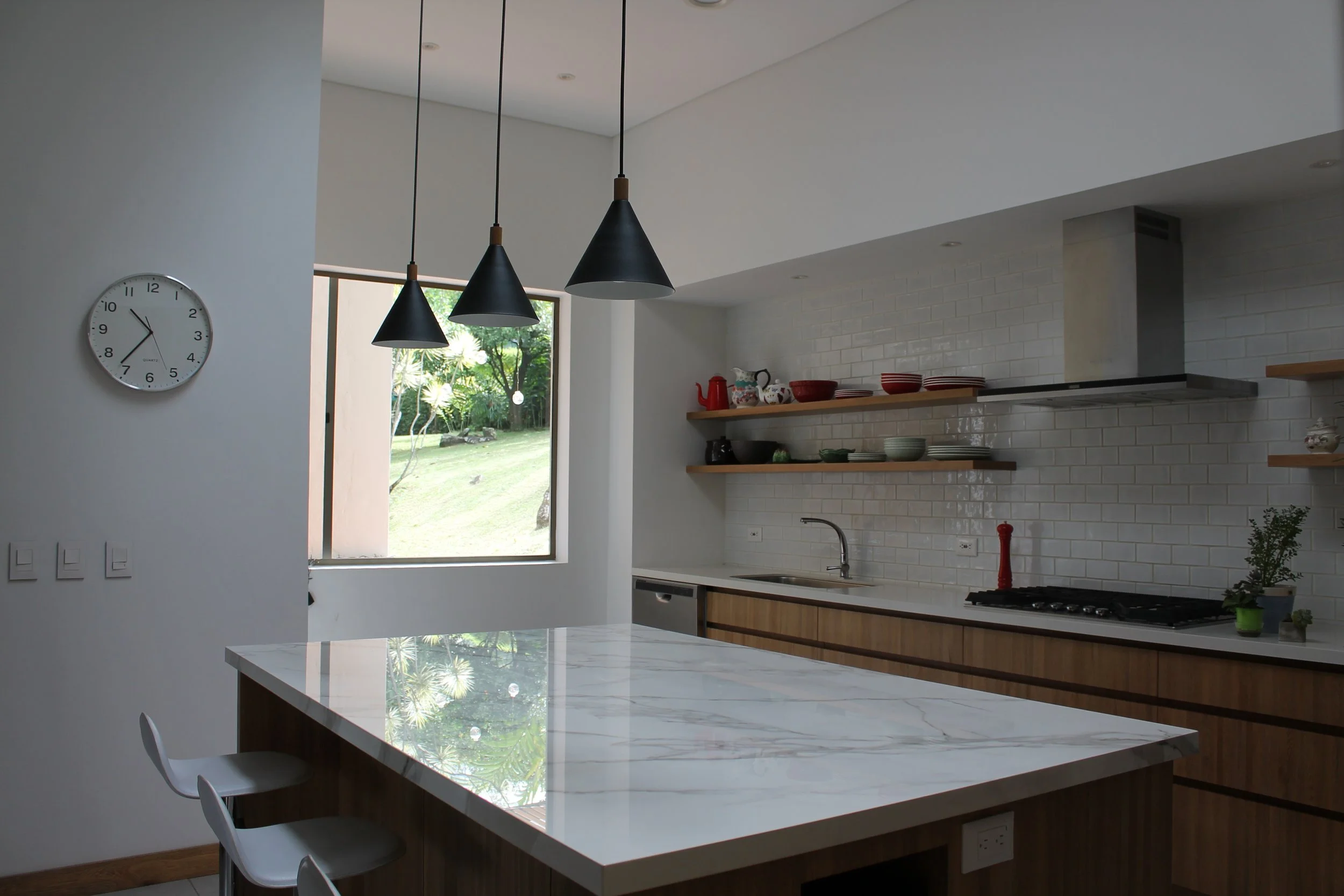 The original kitchen was small and enclosed, with no windows facing the expansive garden. Instead, it looked into a narrow interior patio once used for drying clothes—an area that, along with a large adjacent laundry space and a long internal hallway, occupied more than half of the kitchen’s footprint. This hallway connected the garage to the main entry hall and led to the dining room, separating it entirely from the kitchen. As a result, the kitchen lacked natural light, felt disconnected from the home’s social spaces, and had an inefficient layout: the refrigerator and pantry were located in the hallway, outside the cooking zone and difficult to access.