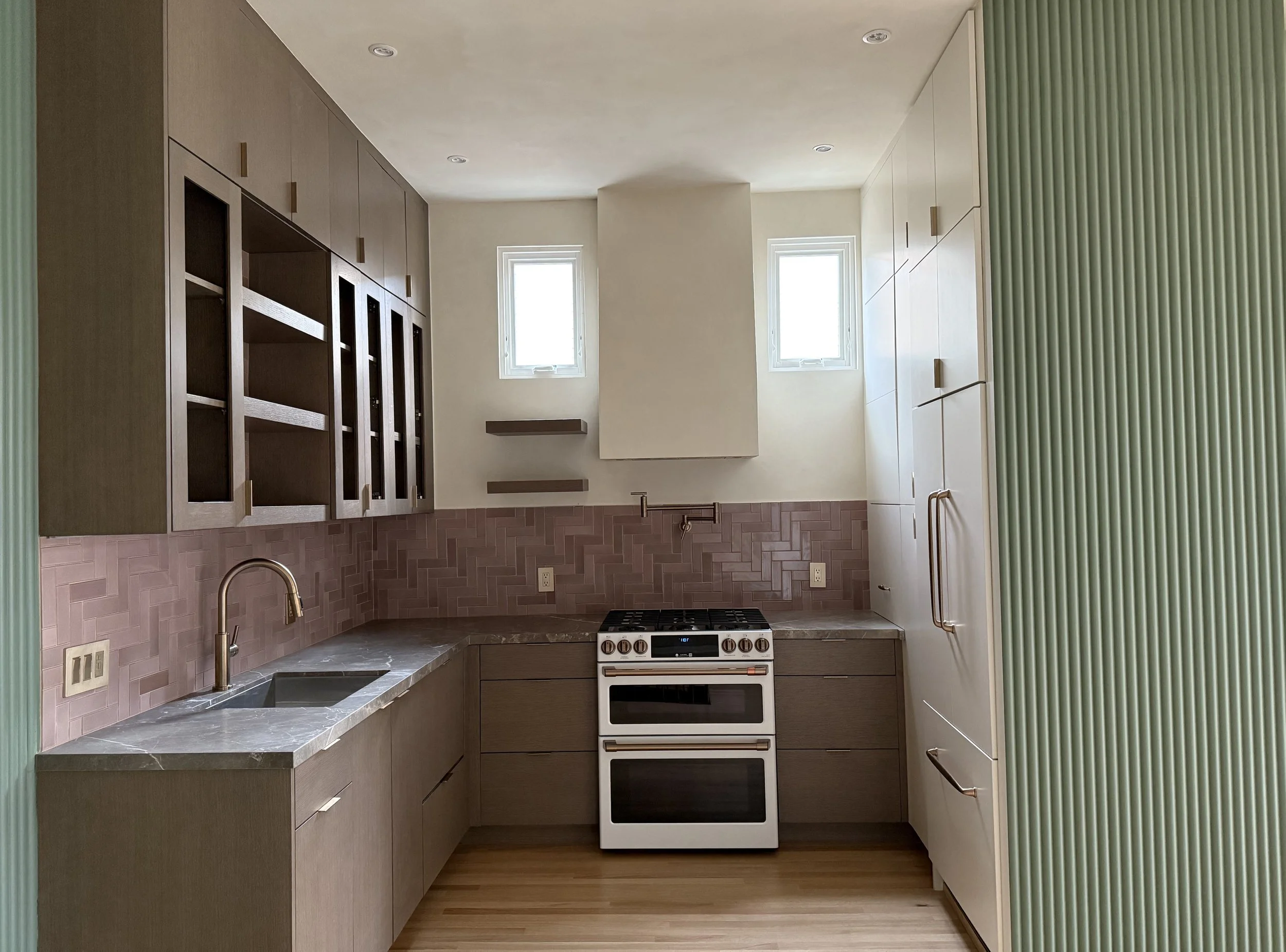 A defining feature of the project is a concealed bathroom door, seamlessly integrated into a wall of decorative panels that introduce a playful pop of color and texture. By shifting the bathroom wall just a few inches, the design made room for a dishwasher—an adjustment that significantly improved functionality. Concealing the door within the paneling helped reduce visual clutter and contributed to a cleaner, more open feel. The result is a small but carefully composed space that balances utility, character, and quiet delight.