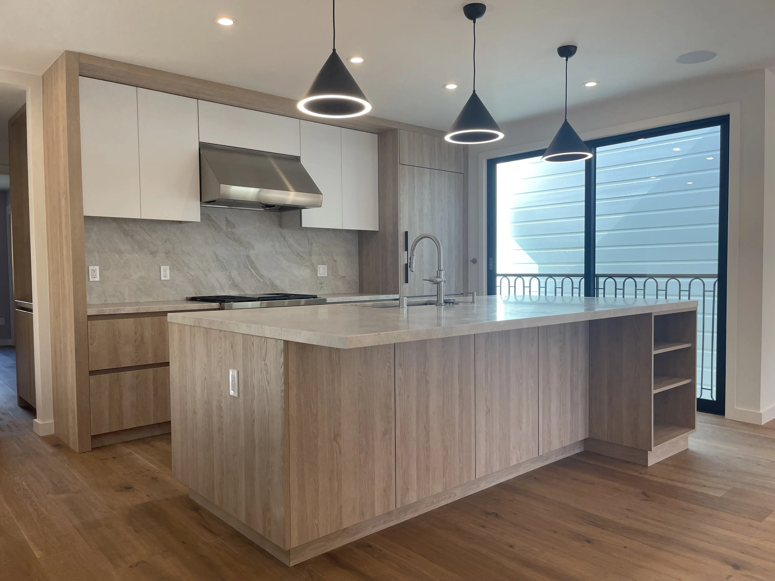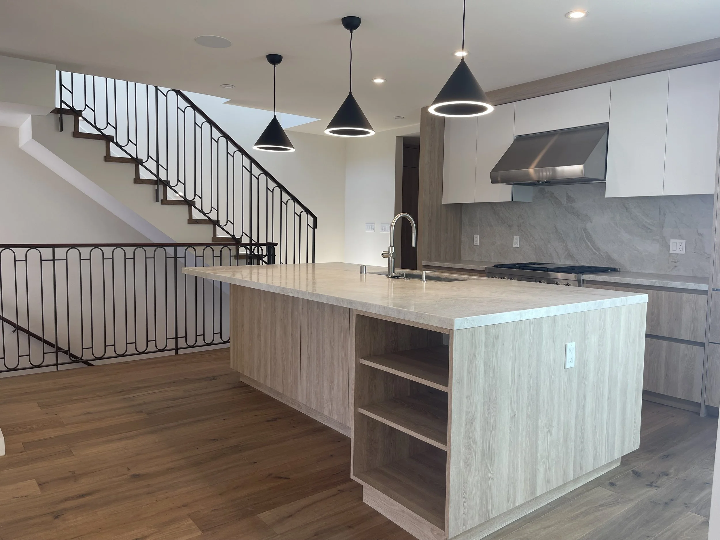 Throughout the home, the material palette is clean and warm, with oak flooring, neutral walls, and refined built-in cabinetry. One of the project’s key custom features is a concealed walk-through pantry behind the minimalist kitchen—outfitted with full-height storage, a secondary freezer, and a coffee bar—providing ample functionality without disrupting the open feel. Additional custom elements include fully integrated millwork in the kitchen and bar, thoughtfully placed lighting, and streamlined detailing that supports the home’s quiet, modern character.