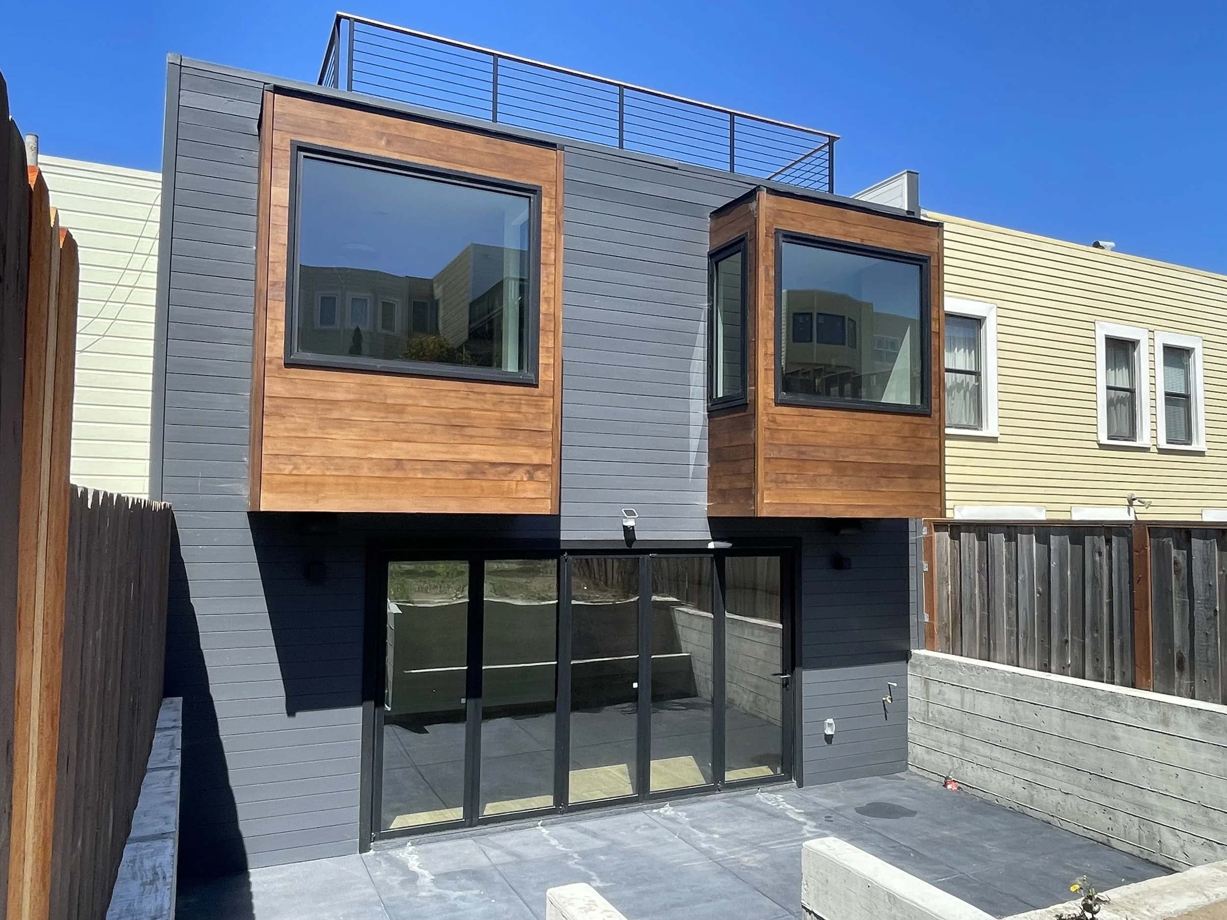 The outdoor spaces are integral to the experience of the home. A giant folding door on the lower level opens the family room to a new rear patio, carved into the site with retaining walls and planted edges to create a generous outdoor room. The roof deck, accessed directly from the primary suite, offers a more private escape with sunlight, open sky, and long views over the neighborhood.